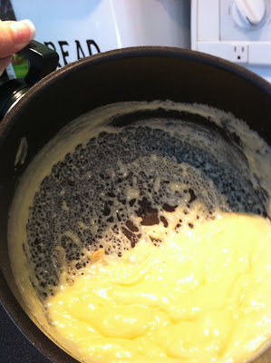 Like here. This takes about 5 min, you have to be stirring and watching there. Do not leave it unattended or it will stick to the bottom of the pan and burn.