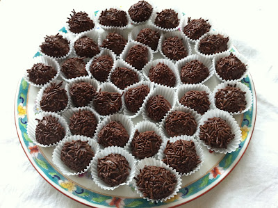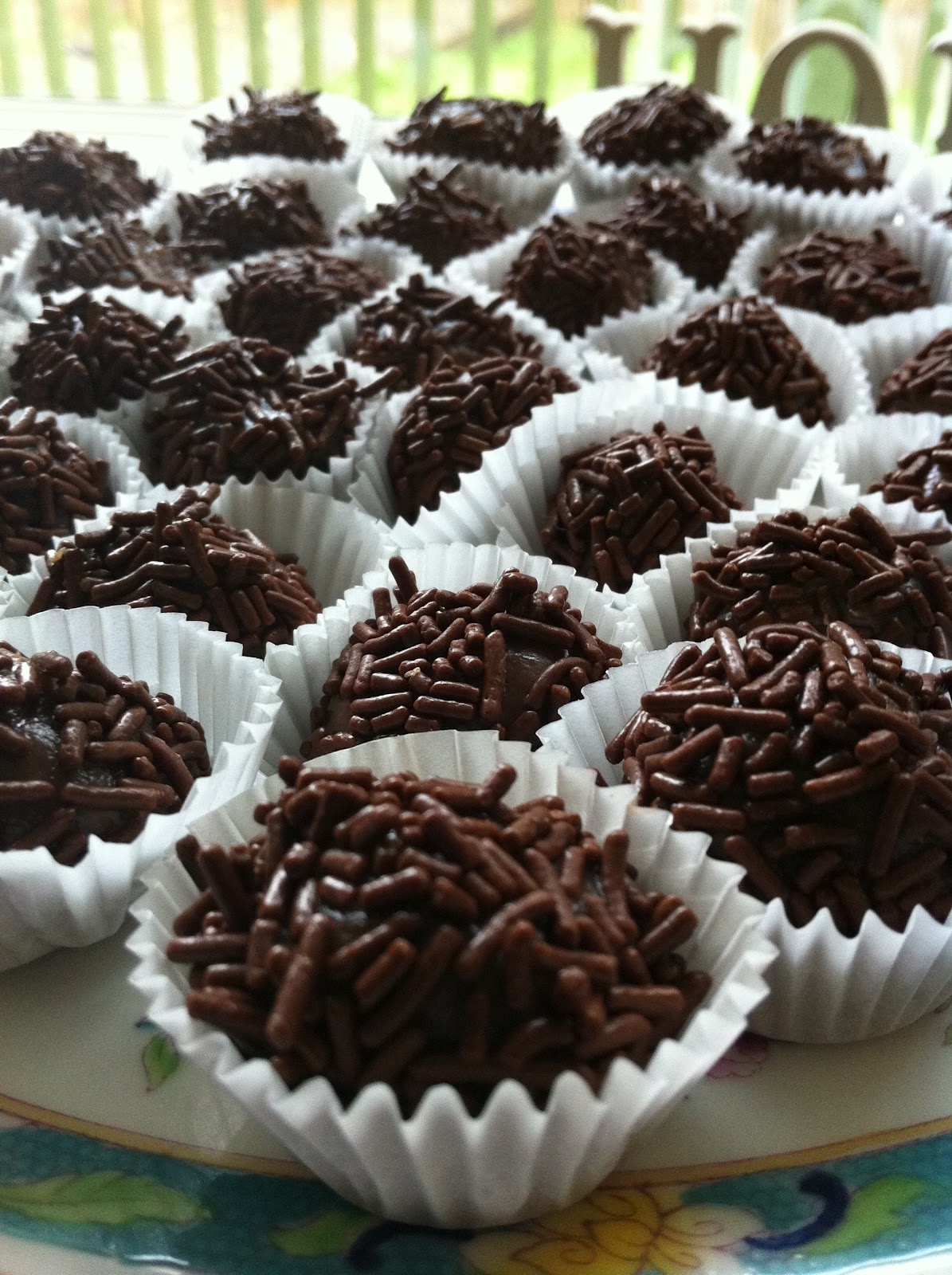 I use regular sugar, but the sprinkles I use real chocolate I buy at a deli close to home. I find the little paper cups at the Dollar Store. But they are a bit bigger than what we use in Brazil. Also in Brazil they have beautiful ones. But anyway, I used the ones I had at home.