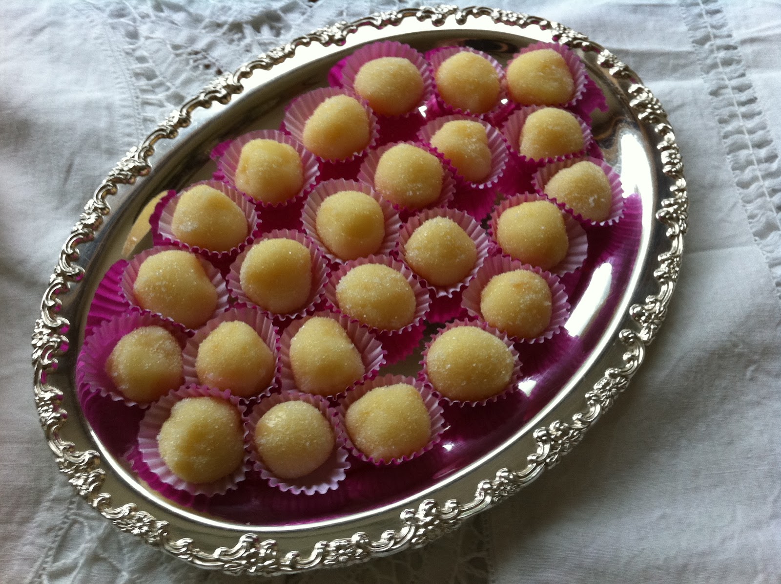 I then put them on the plate with sugar (or sprinkles). When I have about 10 of them, I wash my hands, and dry them and roll the sweets put them in paper and start again with the dough.