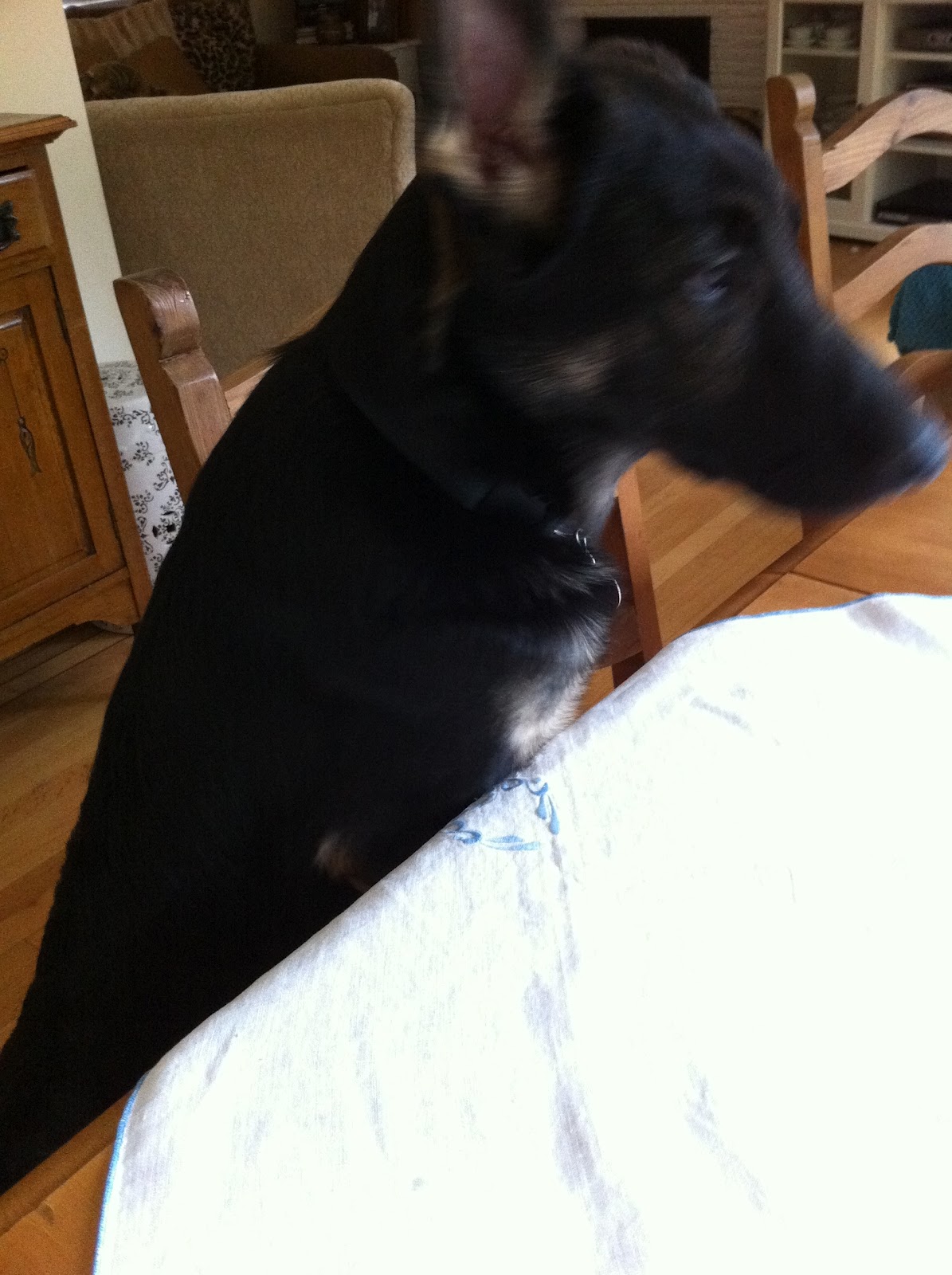 As I turned to get a tea cup in the kitchen, my 5-month old puppy, Axel, went on a chair and ATE A COOKIE!!! That had NEVER happened BEFORE!!!
